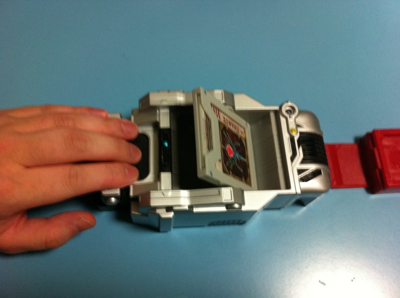 ・カードを入れ、右側のレバーを引くと「ターンアップ」の音声、変身音がなります。これで君もライダーだ!